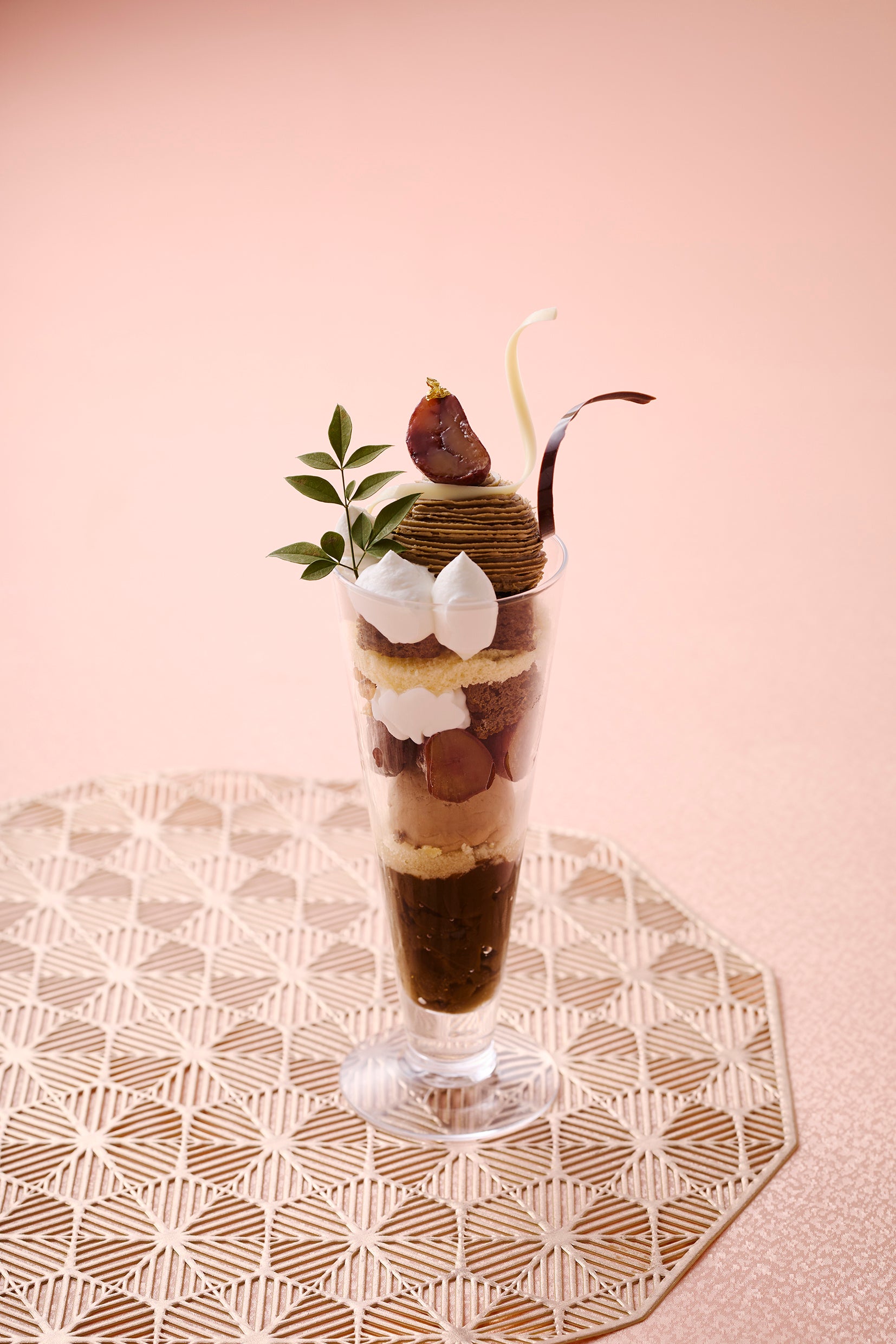 グラスには、香り高い森乃園のほうじ茶を使用したゼリー、アイスクリーム、ブラウニー、わらび餅、モンブランを重ね、異なる食感と香りが織りなす奥行きのある味わいに仕上げました。