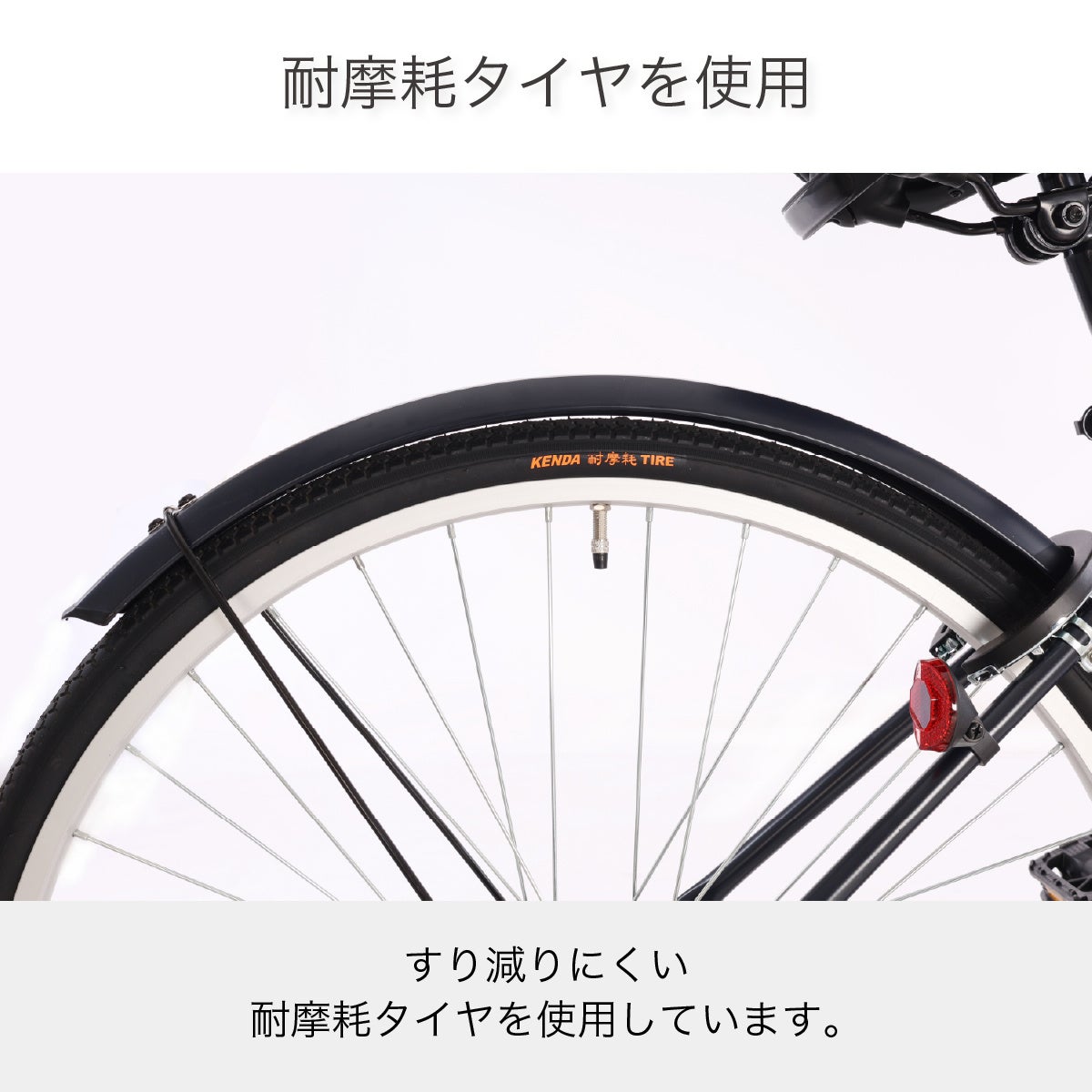 すり減りにくい耐摩耗タイヤを採用し、長期間にわたり快適にご利用いただけるよう配慮しています。さらに、泥よけを備えることで、雨天時でも衣服や荷物が汚れにくく、安心して走行いただける仕様です。