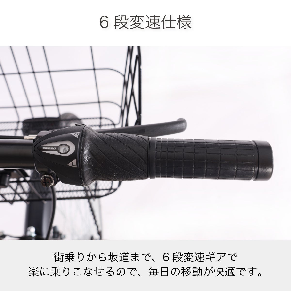 荷物を運びやすいカゴ付き仕様に加え、坂道や街中での走行にも対応した6段変速ギアを搭載しています。さらに、サドル後部に取っ手を設けることで、移動時の取り回しがしやすい設計となっています。