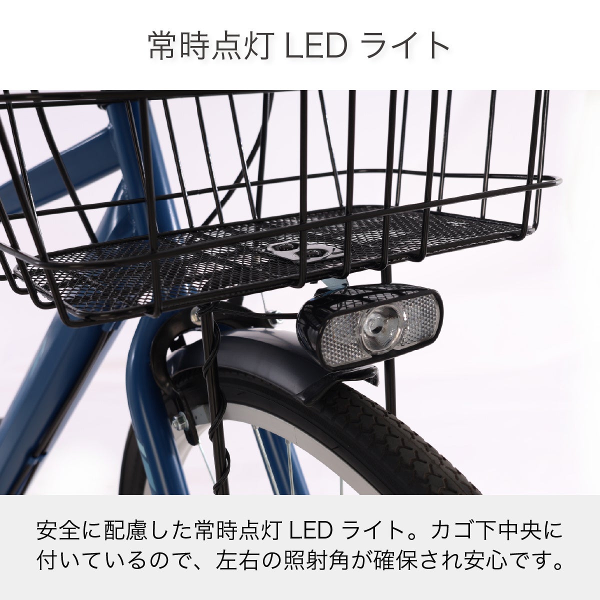 カゴ下中央には常時点灯のLEDライトを搭載しており、電池交換や充電の手間がなく、夜間や暗所でも周囲の状況を確認しやすく安全面に配慮した設計となっています。後輪にはリング錠を装備しており、駐輪時の防犯対策としても安心してご利用いただける仕様です。