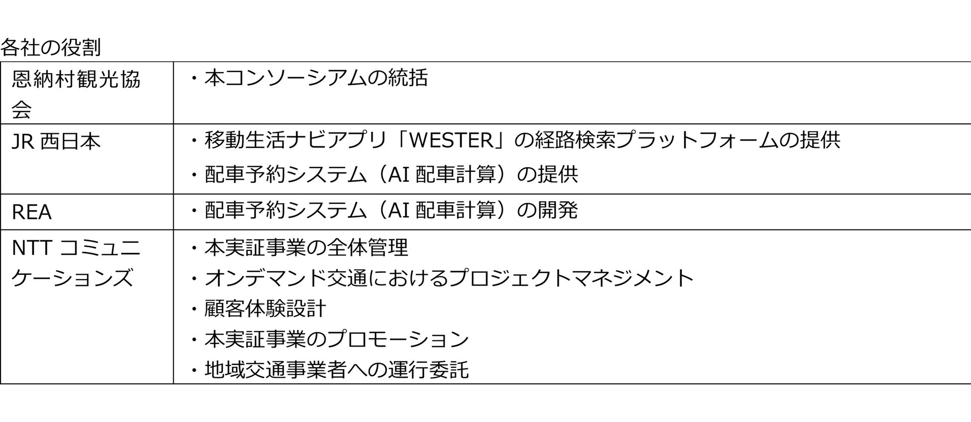 一般社団法人恩納村観光協会(会長:宮﨑 るみ子、以下 恩納村観光協会)、西日本旅客鉄道株式会社(代表取締役社長:長谷川 一明、以下 JR西日本)、株式会社REA (代表取締役社長:坂田 敬次郎、以下 REA)、NTTコミュニケーションズ株式会社(代表取締役社長:小島 克重、以下 NTT Com)が構成する恩納村オンデマンド交通推進コンソーシアム(以下 本コンソーシアム)は、「恩納村内オンデマンド交通※1」運行実証事業※2(以下 本実証事業)を2024年12月1日から開始します。本実証事業により、ホテル従業員の送迎稼働削減をしつつ、観光宿泊客の利便性向上を実現することで、観光宿泊客が観光施設などを利用することによる消費額の増大をめざします。