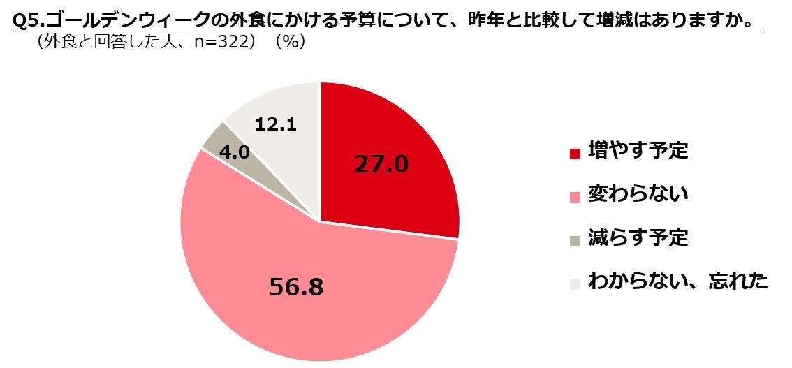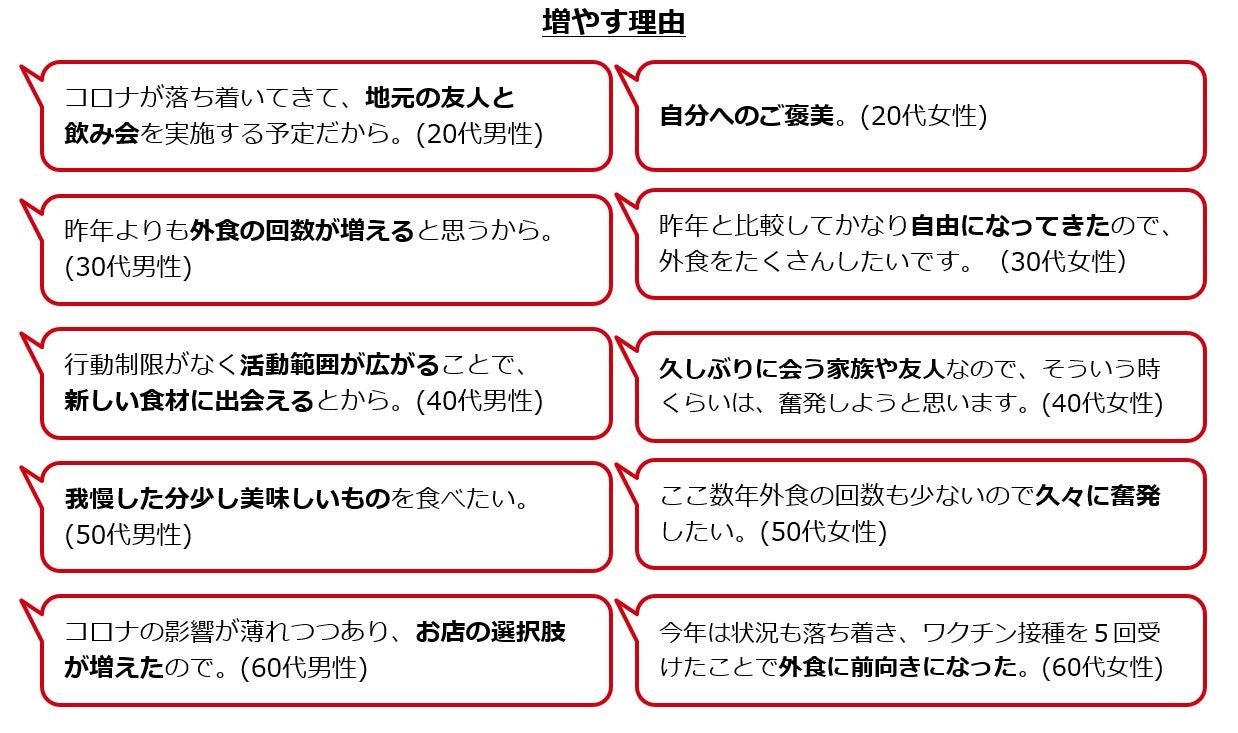 ・外食の1食1人当たりの予算は6,032円で昨年より400円近く上昇。予算の増減は「増やす」が27%。増やす理由は、「昨年よりも出かけて外食する回数が増えそう」「我慢した分美味しいものを食べたい」。