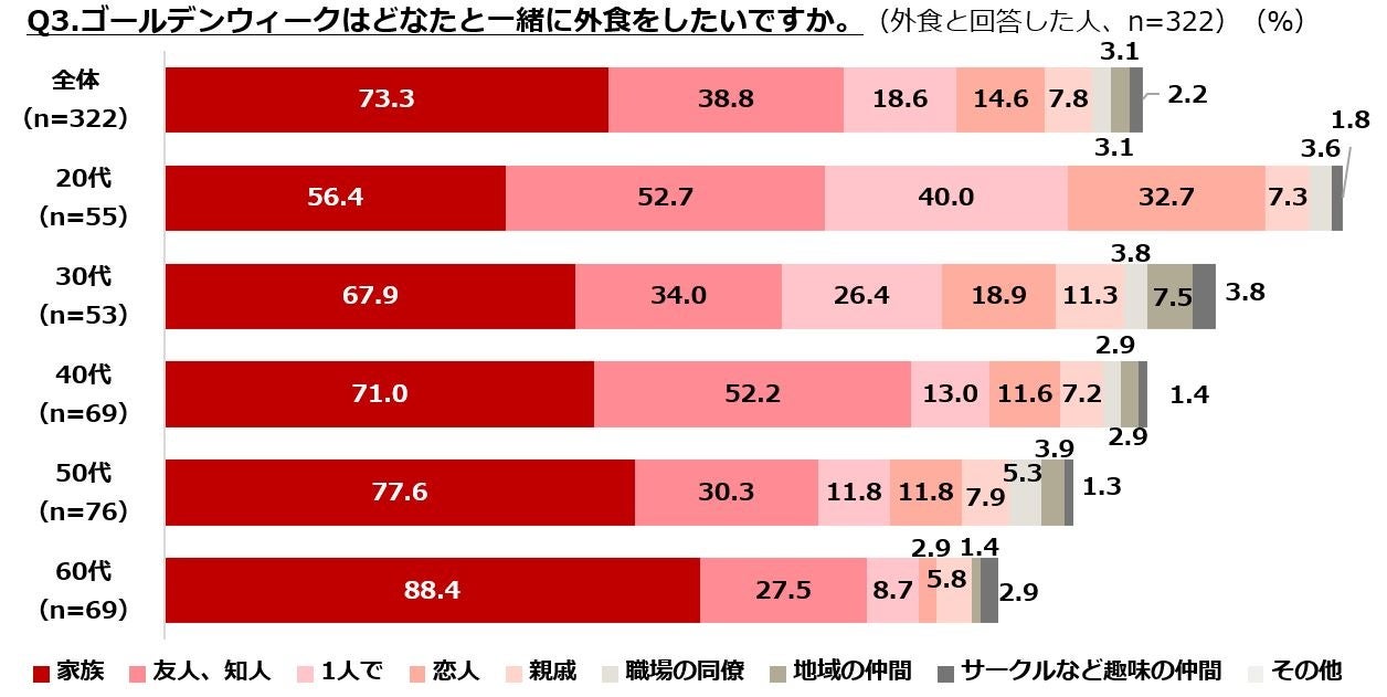 ・外食の相手は「家族」が73.3%「友人、知人」が38.8%。20代と40代は「友人、知人」が50%を