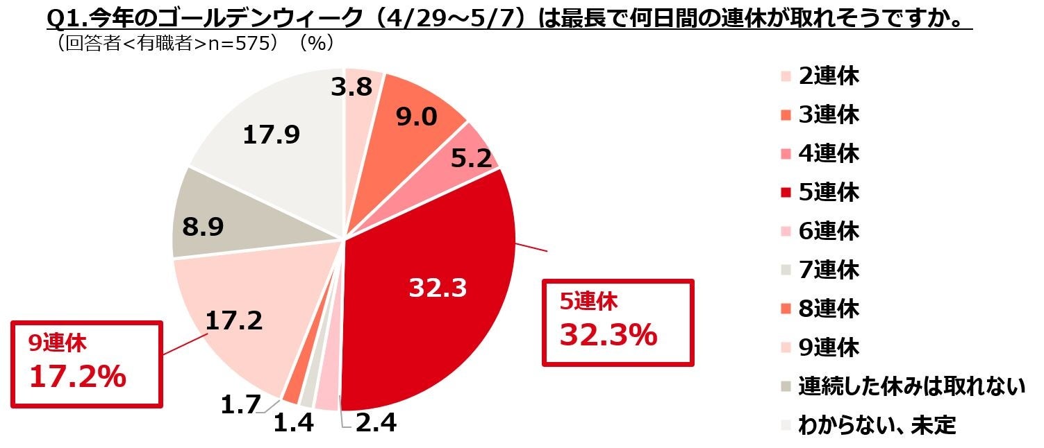 ・今年のゴールデンウィークは、カレンダー通りの「5連休」が32.3%と最多、「9連休」は17.2%に。