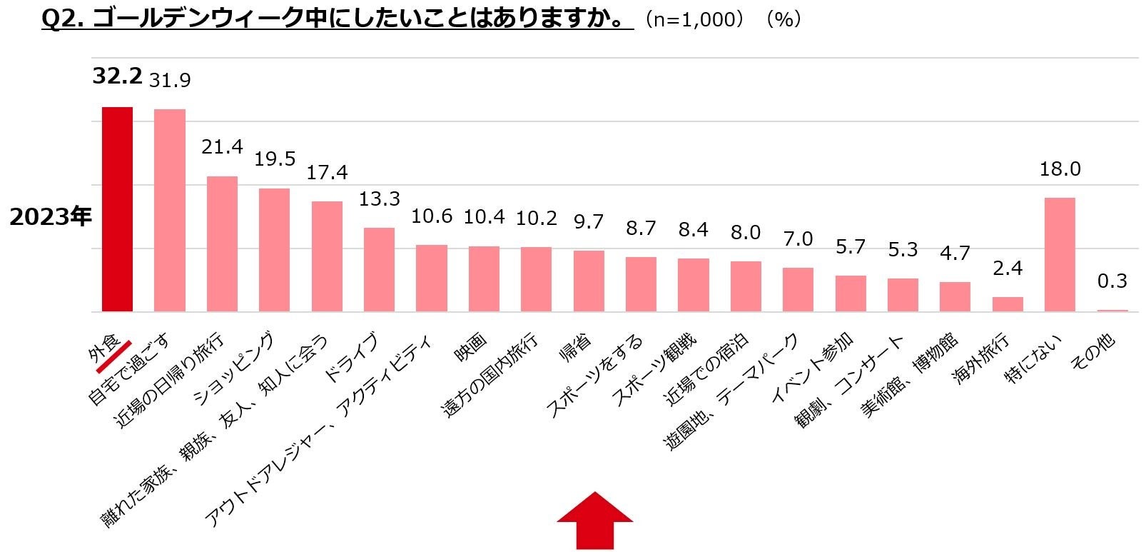 ・ゴールデンウィークにしたいことは、「外食」「自宅で過ごす」「近場の日帰り旅行」がTOP3。「自宅で過ごす」は昨年より減少。
