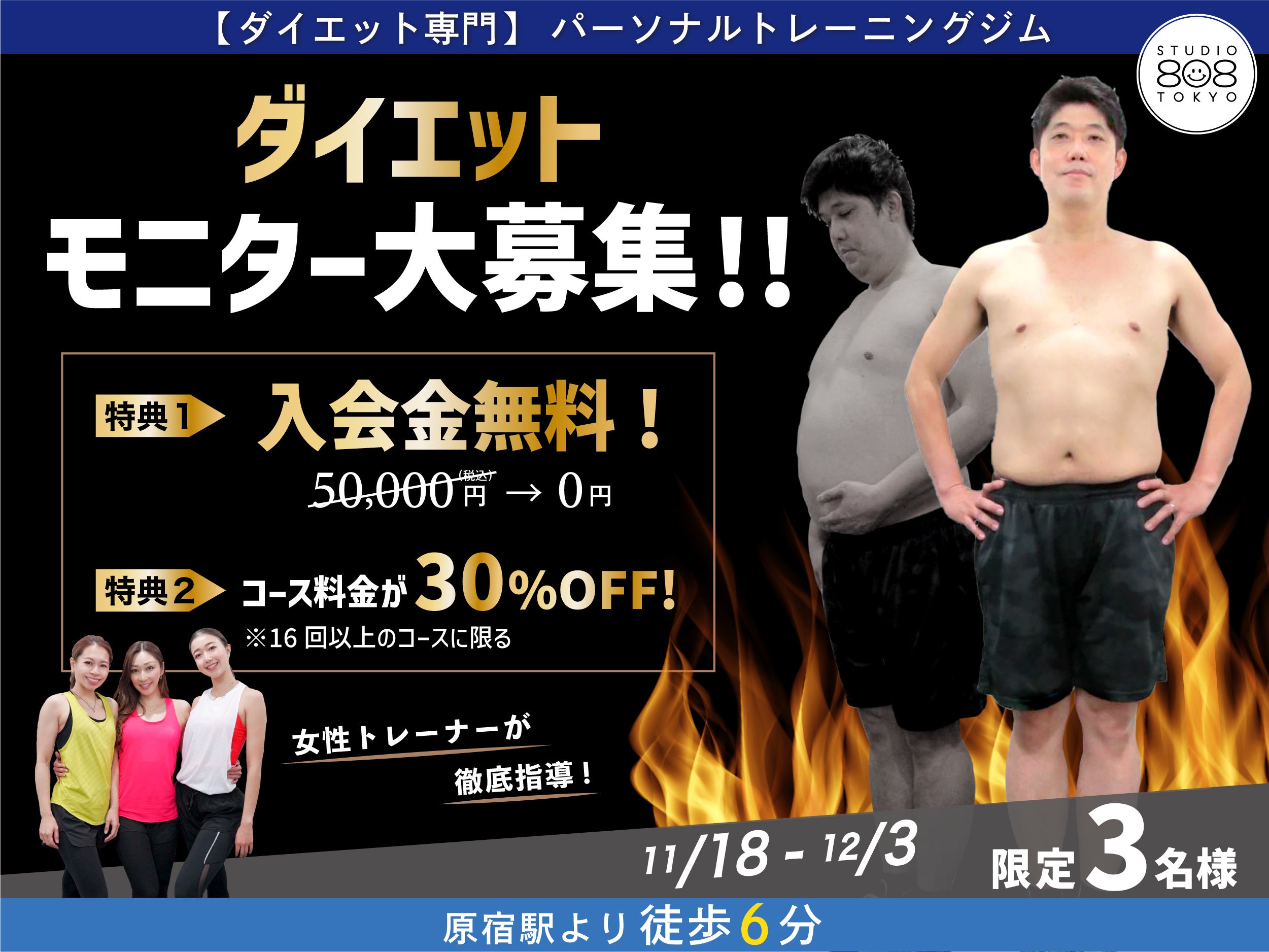 渋谷|原宿|表参道で、お得にダイエットしたい方募集!!【3名限定|ダイエットモニター募集】ダイエット専門パーソナルトレーニングジム "808TOKYO"がお得に通える人気プランを開始!