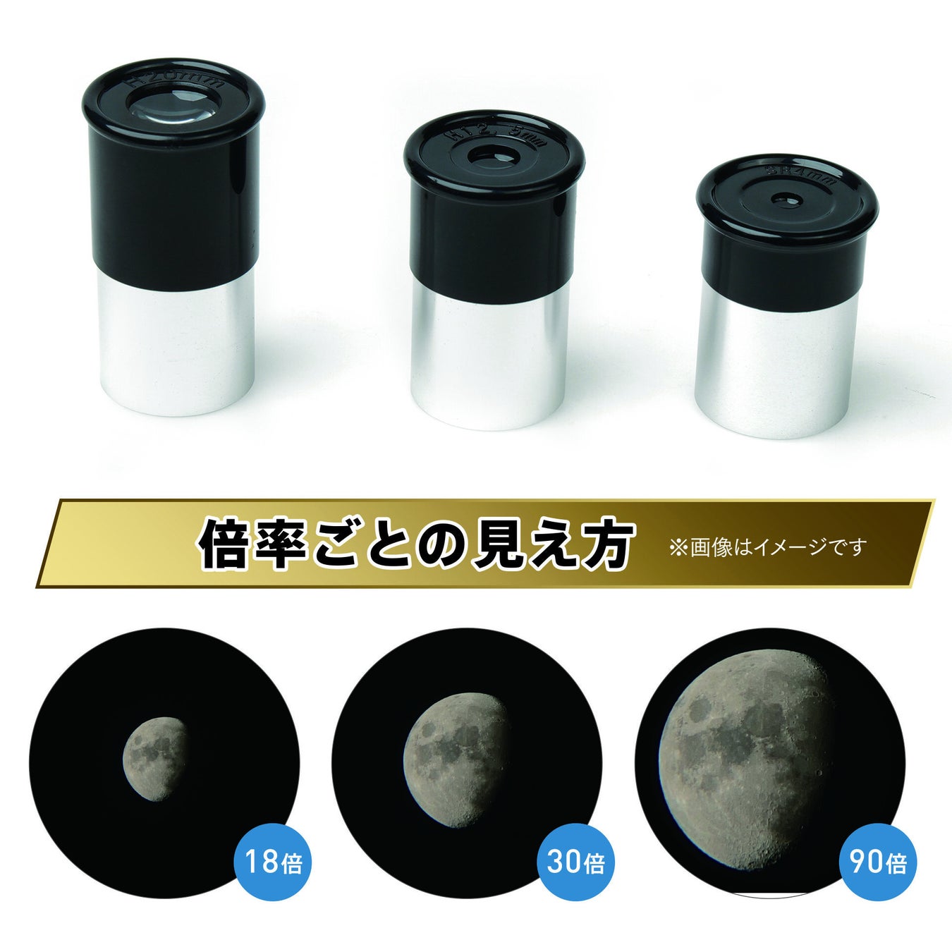 アイピースが3本付属しているので、倍率が18倍・28.8倍・90倍と変更ができ、楽しさが広がります。