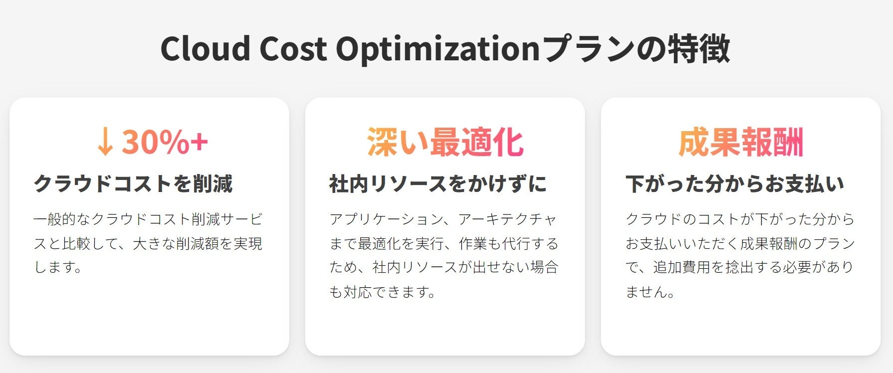 「Cloud Cost Optimizationプラン」(クラウド コスト オプティミゼーションプラン)は、従来の「Vendor プラン」よりもさらに最適なサーバーコストを目指すプランです。無料診断によってコスト削減の余地を可視化し、アプリケーション・アーキテクチャの最適化まで踏み込んで改善作業を代行することで、さらなるコスト最適化を実現します。プランに作業代行が含まれるため、ユーザーは大幅な社内リソースを割かずにサーバーコストの最適化を実施できるほか、実際に削減された分から費用が発生する成果報酬型プランのため、追加予算を捻出せずに取り組めます。