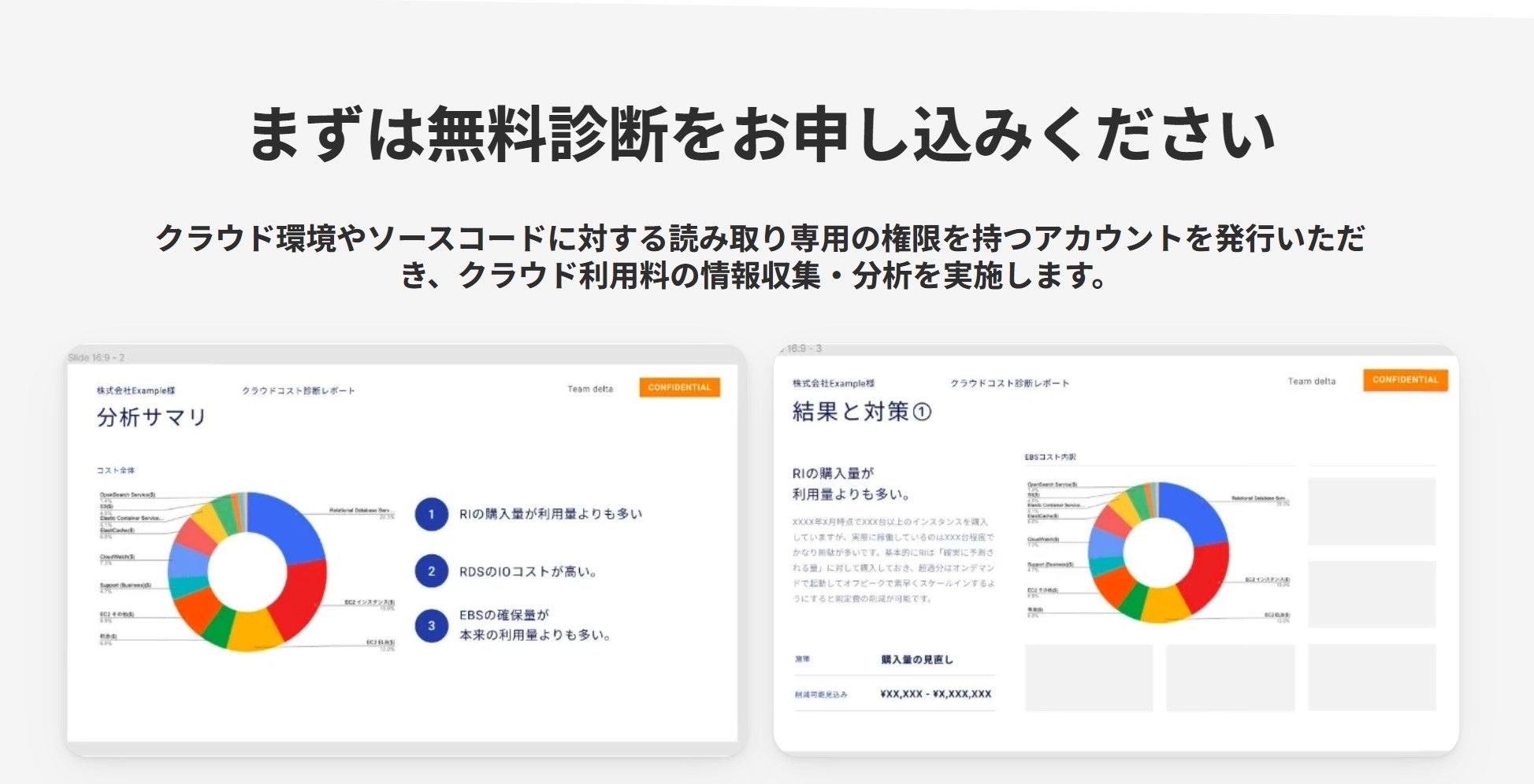 株式会社DELTAが運営する、成功報酬型のサーバーコスト削減代行サービスです。過去150社以上の診断・削減実績がございます。