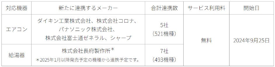 今回、エアコンに関しては、IoT機器の通信規格「ECHONET Lite」に対応した当社製の過去のモデルに加え、4社の他社製エアコン 計521機種(※6)に連携機種を拡大。すでに設置されているエアコンでも本サービスをご利用いただけるようになりました。また給湯器は、余剰電力の活用機能を向上させるとともに、新たに株式会社長府製作所(以下「長府製作所」)製のエコキュートにも対応。対象機種が、計7社(※7)の給湯器 計493機種に拡大しました。