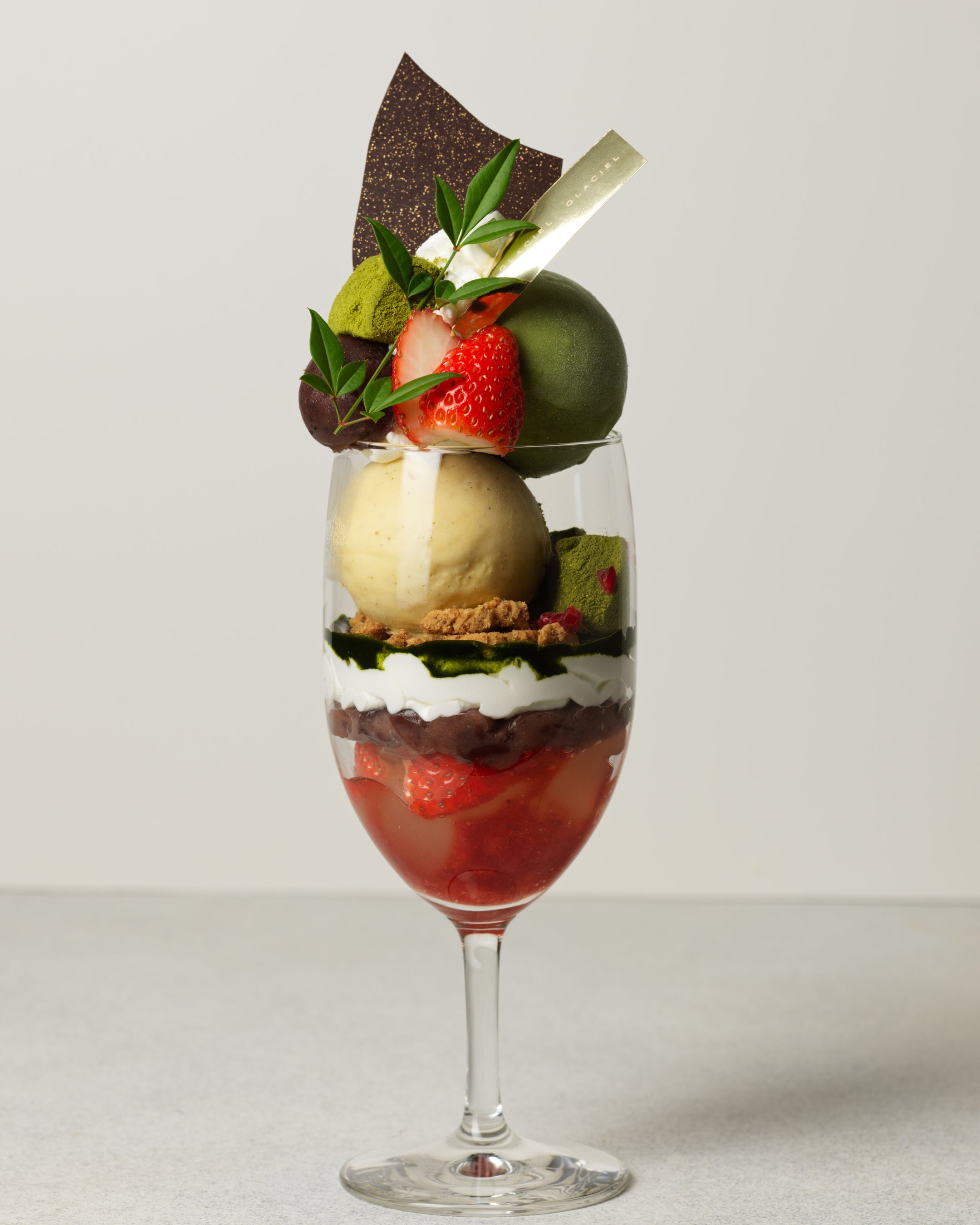 グラス抹茶とグラスヴァニーユに、ほのかな甘み広がる粒あんと、風味豊かな抹茶きな粉わらび餅をトッピングし、深みの中にさっぱりとした味わいを演出。小豆カスタードをしのばせることでコクをプラス。甘酸っぱい苺入りの柚子ソースとともに後味は爽やかに仕立てました。一足早い春を感じさせる、今だけのパルフェぜひお楽しみください。