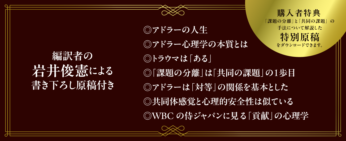 それに対する、岩井氏の考え・思いを述べた書き下ろし原稿も「はじめに」に掲載されています。編訳者の岩井俊憲氏はは、日本にアドラーを伝え続けて40年、著者累計100万部を超えています。