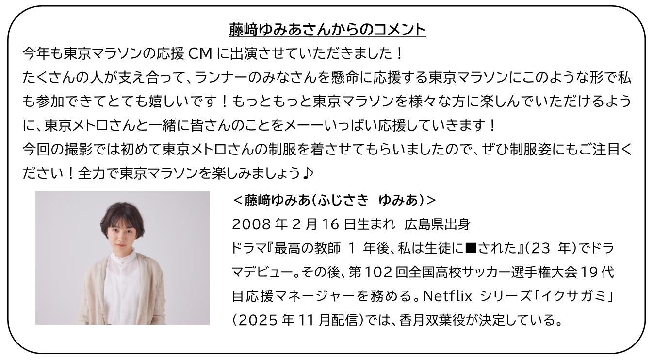 大会中継内のTVCMや、Tokyo Metro Vision(車内ビジョン)、東京マラソンEXPO 2025の東京メトロブース等で放映します。藤﨑ゆみあさんより、TVCMの見どころと応援メッセージを寄せていただきました。 < 東京マラソン応援CMはこちら:https://youtu.be/TnbqzWujG0w >