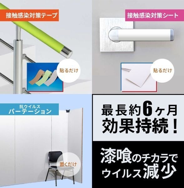 製品表面にコーティングされた漆喰塗料により、表面に付着したウイルス・細菌の感染力を低下させるので接触感染や菌・ウイルスの持ち込み対策ができます。