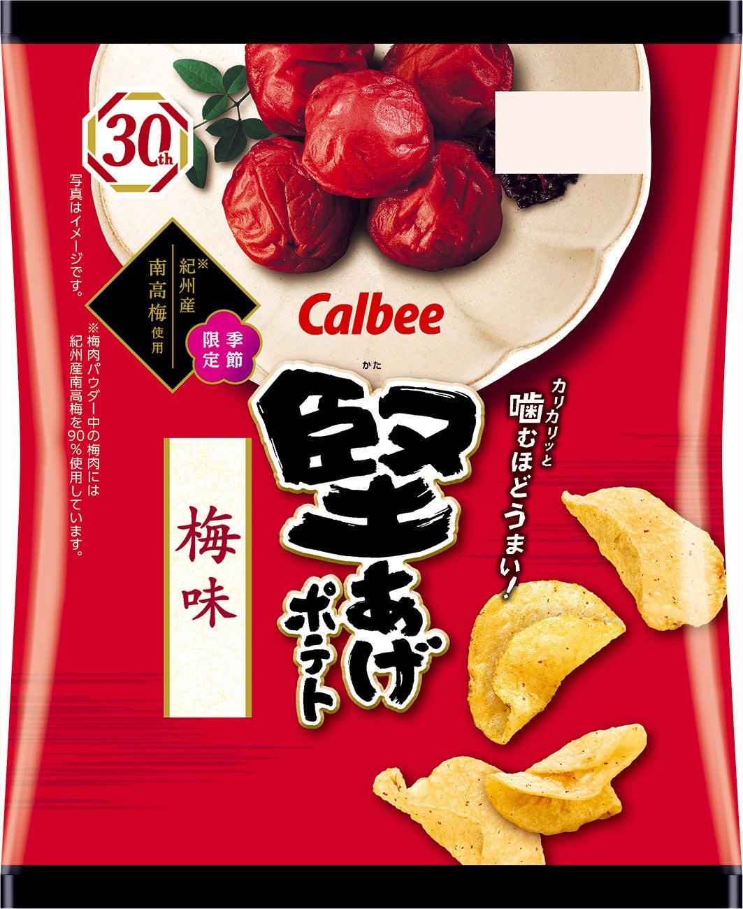 ●『堅あげポテト 梅味』は、紀州産南高梅※のシンプルな梅の酸味と旨味を梅しそパウダーで引き立て、隠し味に黒糖を加えています。今年は梅肉パウダーを増量し、より本格的な風味を楽しんでいただけます。パッケージの左上には「堅あげポテト」ブランド発売30周年を訴求するロゴを追加。マットインクを使用し、上質感を表現しました。
