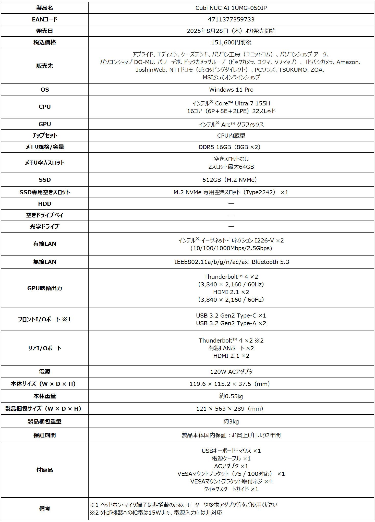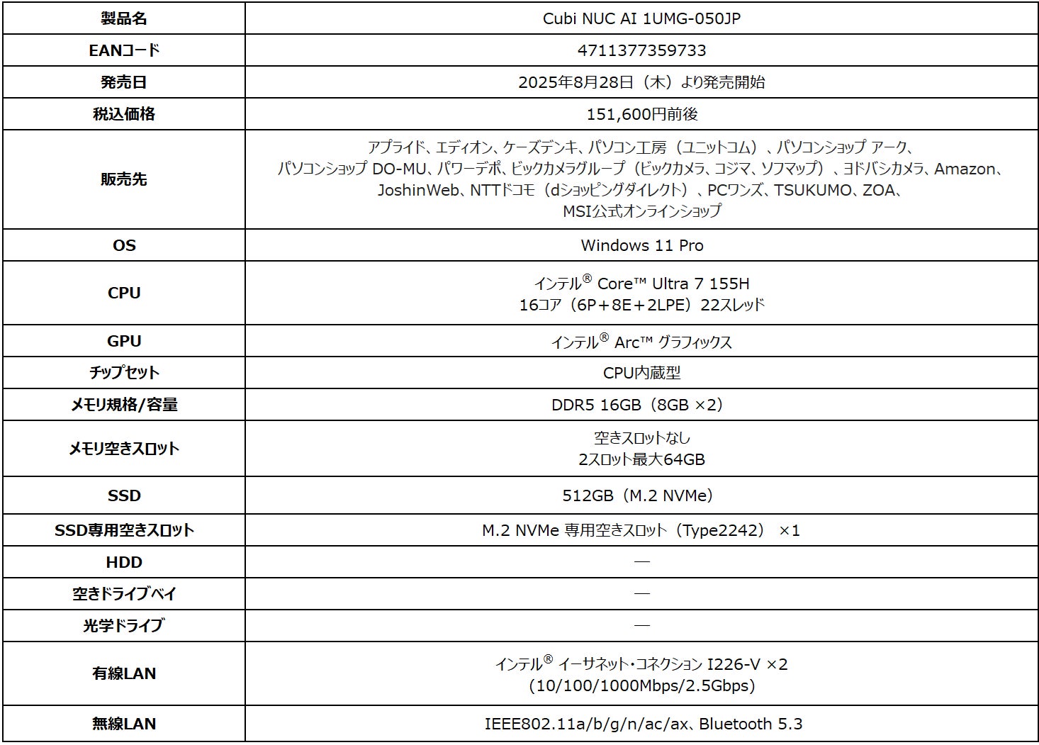 https://jp.msi.com/Business-Productivity-PC/Cubi-NUC-AI-1UMG-050JP