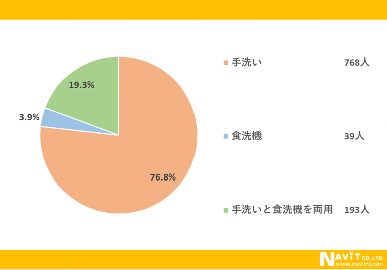 「台所の洗い物はどの様にしますか?」という質問については、「手洗い」が76.8%、「食洗機」が3.9%、「手洗いと食洗機を両用」が19.3%という結果になりました。