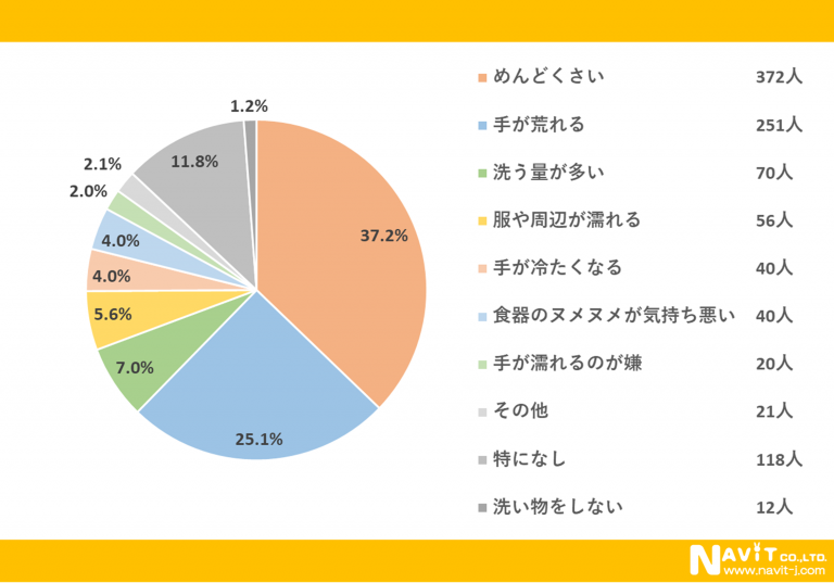 「台所の洗い物に負担・不満はありますか?」という質問については、「めんどくさい」が37.2%、「手が荒れる」が25.1%、「洗う量が多い」が7.0%という順になりました。