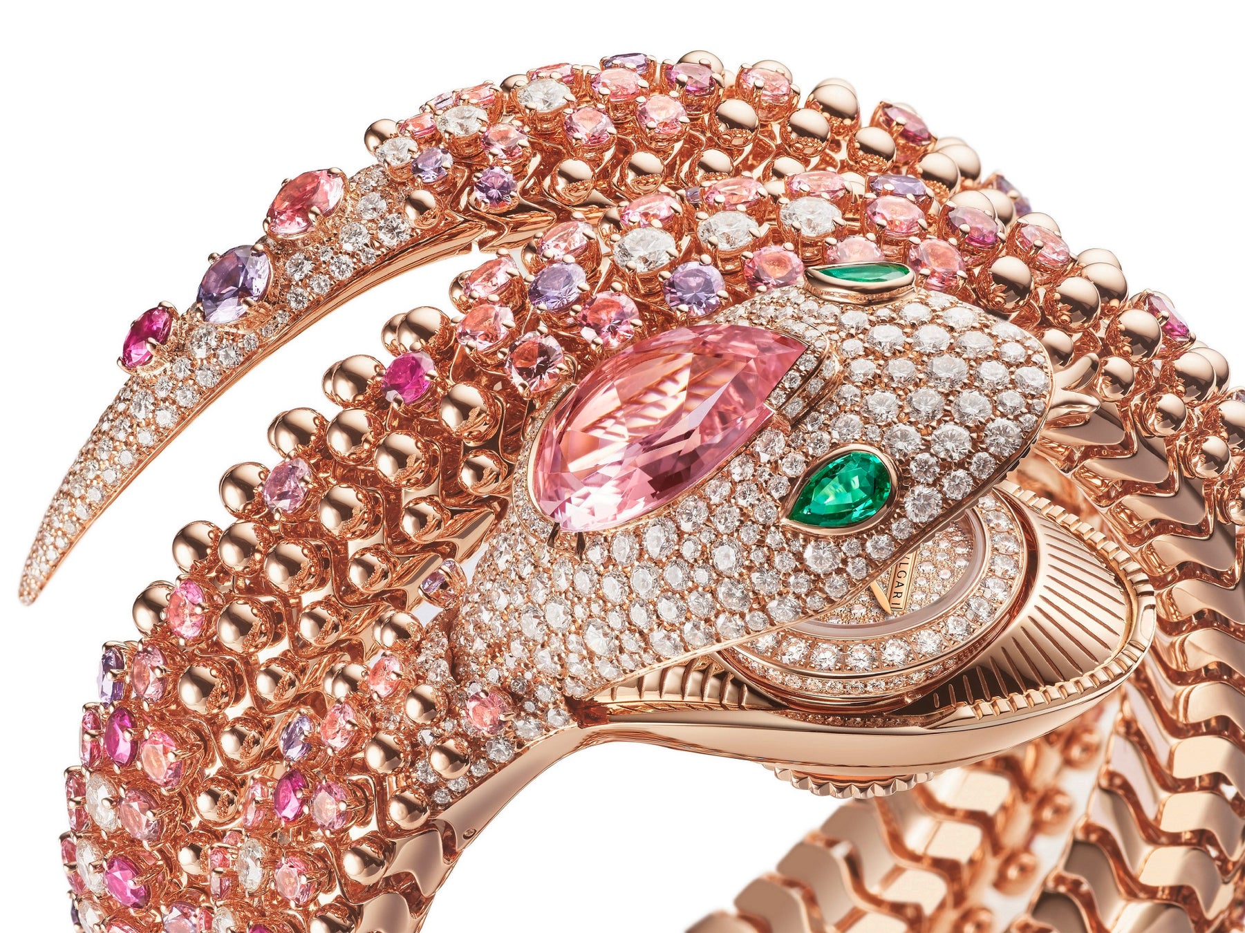 時計の世界では、今年誕生75周年を迎えるブルガリの伝説的アイコンであるセルペンティが優美な宝石、時代を超越したデザイン、大胆な創意性にあふれたクラフツマンシップのもと、新たな変身を遂げました。1955年発表のブルガリを代表するヘリテージタイムピースからインスピレーションを得た「セルペンティ ミステリオーシ パリーニ」は、18Kピンクゴールド製のビーズが施されたしなやかな曲線を形づくるボディに、パープルサファイア、ピンクトルマリン、ガーネット、スピネル、ダイヤモンドをセットし、魅惑的なピースにしあげました。ウォッチが収められたヘッドはラウンドブリリアントカットのダイヤモンドで覆われ、頭頂にあしらわれた5.45カラットのペアシェイプのモルガナイトが地中海に沈む夕日をイメージさせる宝石のパレットにピーチカラーのニュアンスを添えています。細かな手作業と熟練の技を駆使して作られしなやかに手首に巻き付くこのタイムピースは、完成までに510時間を要します。さらにブルガリが誇る最小の自社製機械式ムーブメント、「ピコリッシモ」が搭載されています。