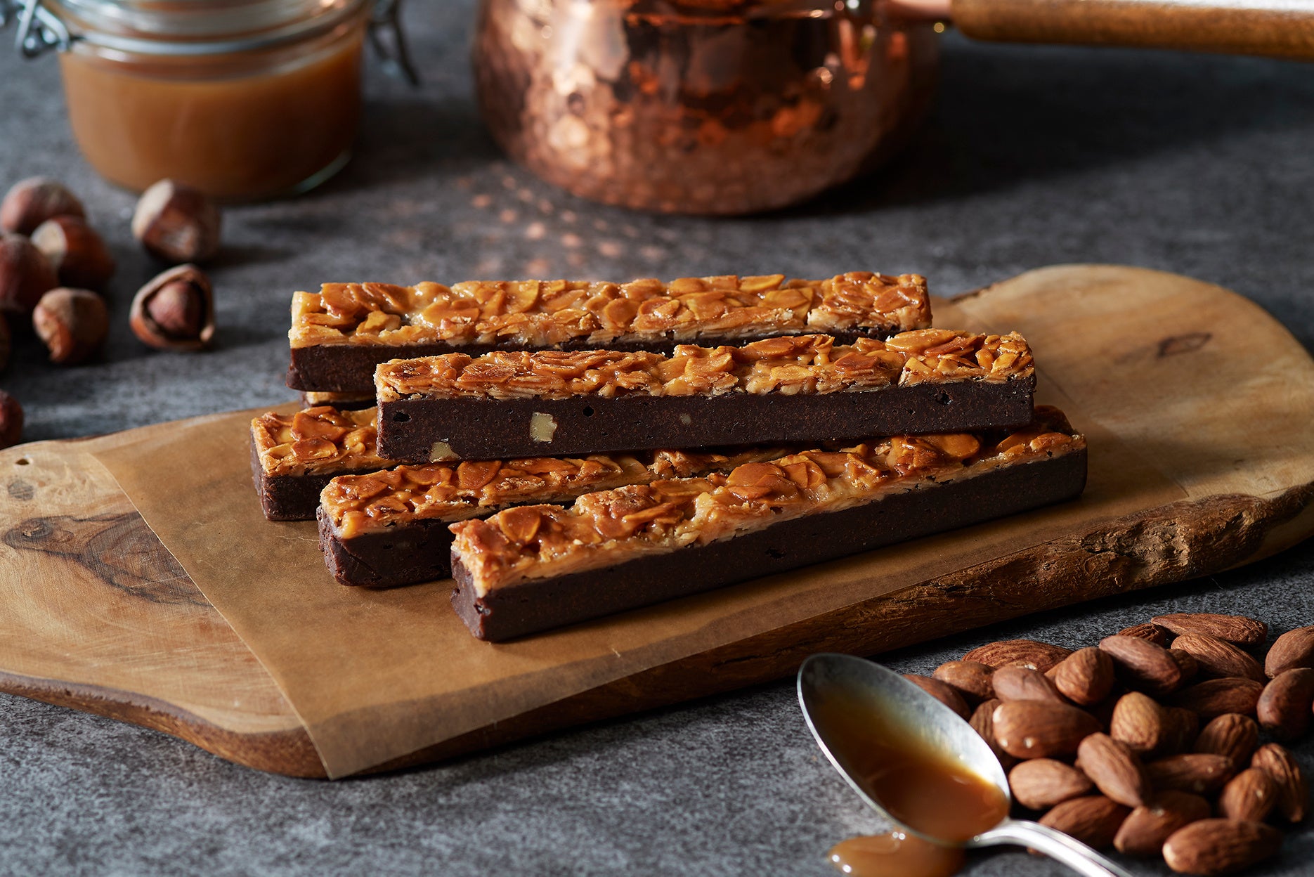 ナッツの香ばしさが特徴の生ブラウニー。ヘーゼルナッツペーストを混ぜ込んだブラウニー生地の上に、アーモンドとカラメルのヌガーを重ねました。