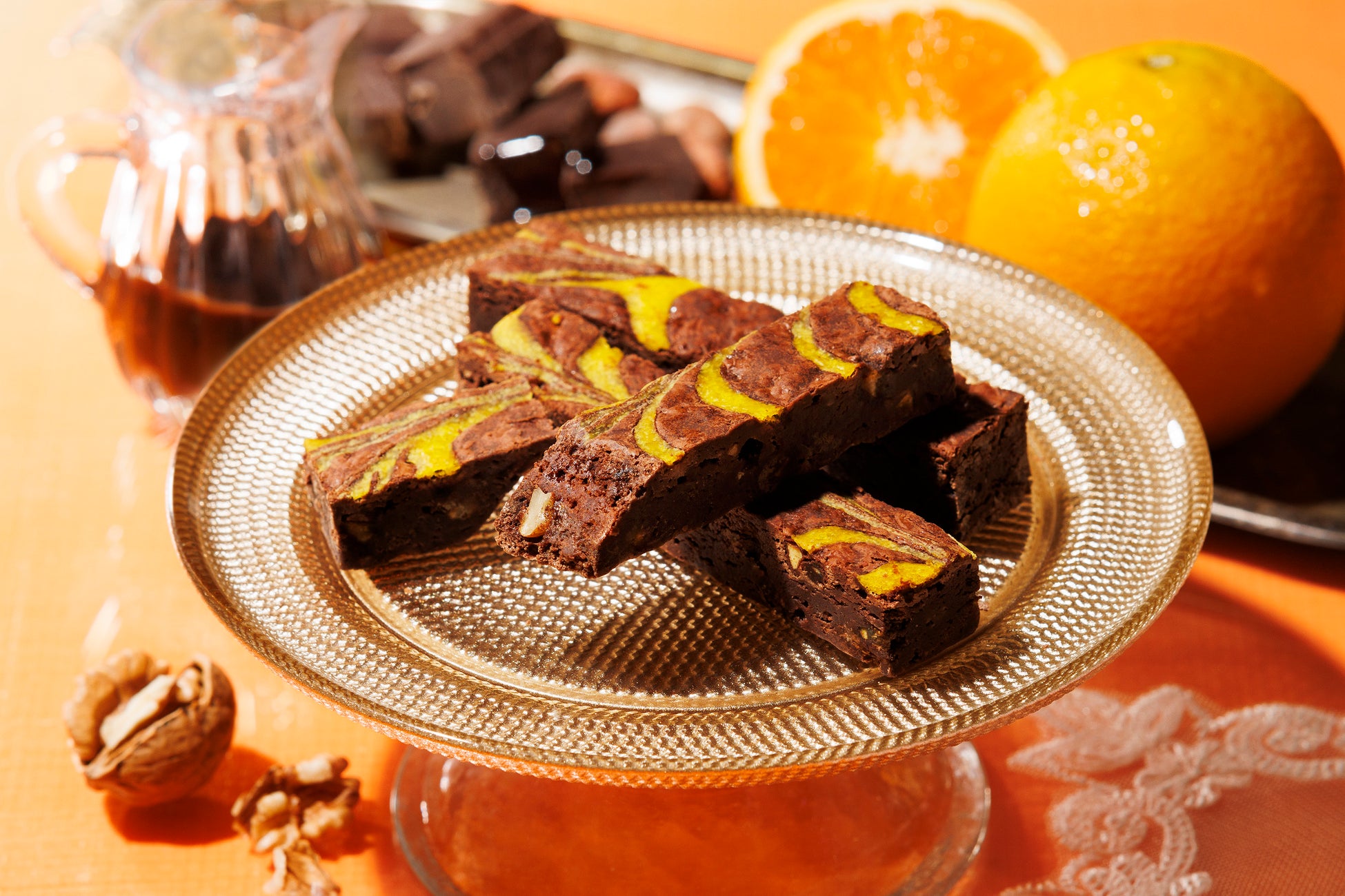 バレンシアオレンジとトリプルセック(オレンジリキュール)を生地に練り込んだ、濃厚なチョコレートに爽やかな柑橘が香る生ブラウニー。見た目も鮮やかに仕立てました。