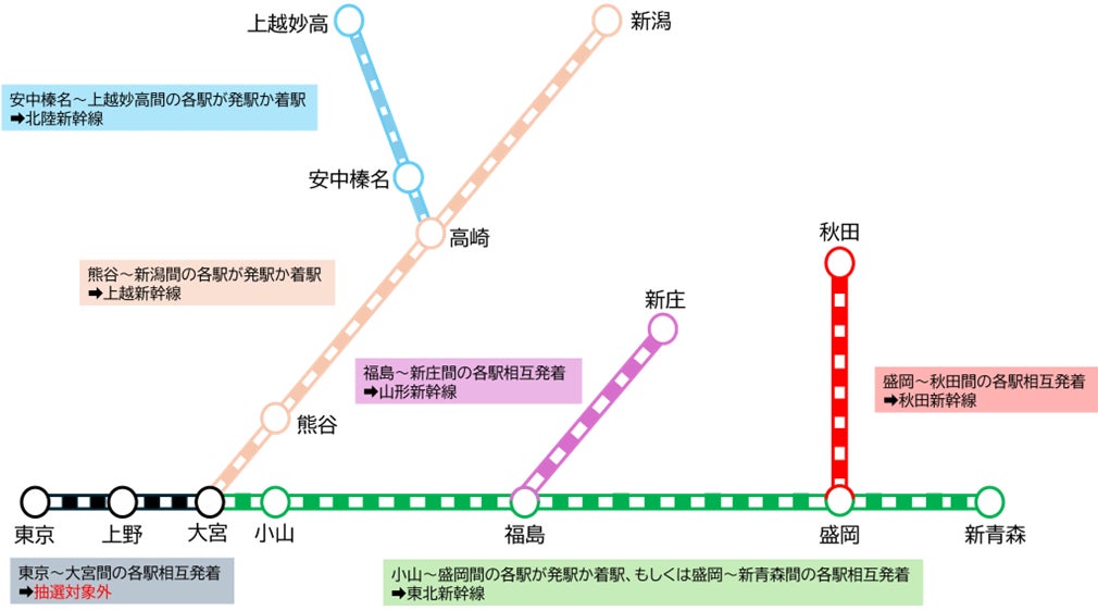 JR東日本管内の新幹線停車駅相互間 ※ただし、東京~大宮間の各駅相互間でのご利用を除きます。 【抽選対象外となる区間】 東京⇔上野 東京⇔大宮 上野⇔大宮 |