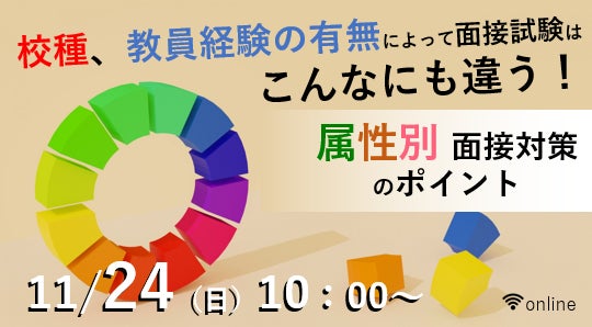 【教員採用試験】オンラインセミナー「校種、教員経験の有無によって面接試験はこんなにも違う!属性別 面接対策のポイント」を11/24(日)に開催
