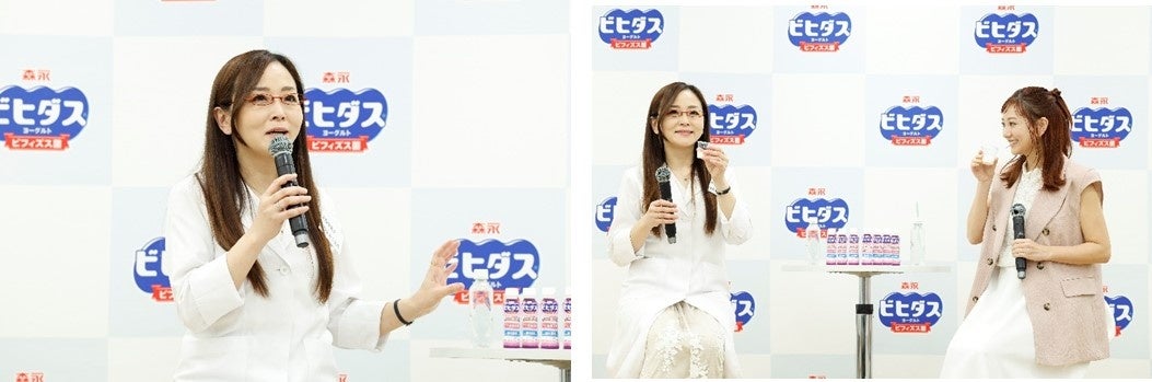 「ビヒダス ヨーグルト 便通改善 1日分の鉄分 ドリンクタイプ」新商品発表会に元AAA伊藤千晃さんと管理栄養士浅野まみこさんが登場!伊藤さんの腸活生活や子供のころから好きな味について語る