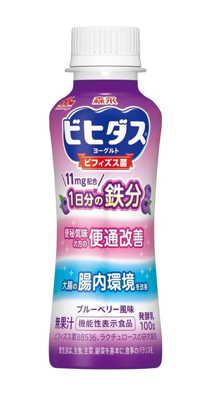 新商品の「ビヒダス ヨーグルト 便通改善 1日分の鉄分 ドリンクタイプ」は、発売からシリーズ累計出荷個数2億個※1を突破した「ビヒダス ヨーグルト 便通改善」の新商品です。大腸の腸内環境を改善し、便秘気味の方の便通を改善する機能が報告されている『ビフィズス菌BB536』に加え、腸内環境を良好にする(善玉菌の代表であるビフィズス菌を増やす)機能や、お通じを増やす(排便回数を増やす)機能が報告されている『ラクチュロース』を機能性関与成分としました。さらに「成人女性(30~64歳/月経有※2)の鉄分の摂取推奨量10.5㎎」を上回る鉄分11mgを含んでおり、1本で1日分の鉄分※3を摂ることができます。また、味わいにもこだわり、お召し上がりやすい爽やかなブルーベリー味に仕上げました。