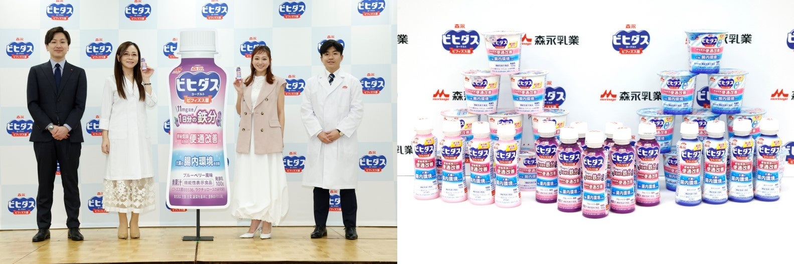 森永乳業は、「ビヒダス ヨーグルト 便通改善 1日分の鉄分 ドリンクタイプ」を4月8日(火)より全国で新発売します。これを記念して、3月27日(木)に大手町サンケイビルにて『「ビヒダス ヨーグルト 便通改善 1日分の鉄分 ドリンクタイプ」新商品発表会』を開催し、アーティスト・タレントの伊藤千晃さんと管理栄養士の浅野まみこさんがゲストで登壇しました。