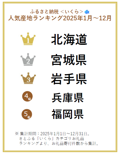 2025年1月~12月の「いくら」の寄付件数を基に算出した人気産地ランキングでは、北海道が全体の9割以上を占める圧倒的なシェアで1位に輝きました。続く2位は宮城県、3位は岩手県です。