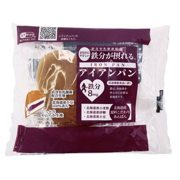 女性が不足しがちな鉄分を補う、『乳酸菌鉄』配合。女性を応援するハート形のアンパンです。鉄分は食事からは吸収しにくいことが特徴であり、日本人女性の7割が鉄不足と言われています。アイアンパンに使用している『鉄含有乳酸菌(乳酸菌鉄)』は有用性、安全性、吸収性に優れ、お腹に優しい鉄分を摂取できます