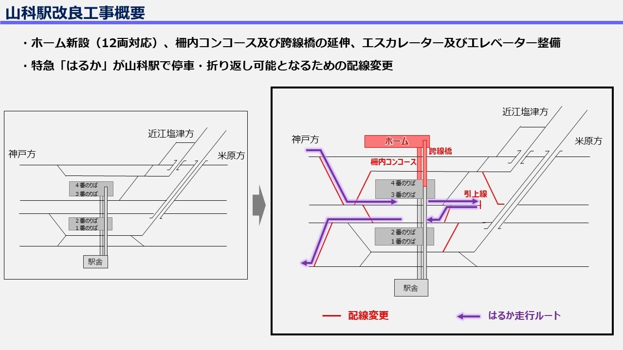 この度、山科駅を京の東の玄関口として利用いただくため、改良工事に着手することとしました。工事完成後は、京都駅発着としている特急「はるか」を山科駅まで延伸します。山科駅では地下鉄東西線等へ乗り換えいただくことで京都市内アクセスがより便利になります。
