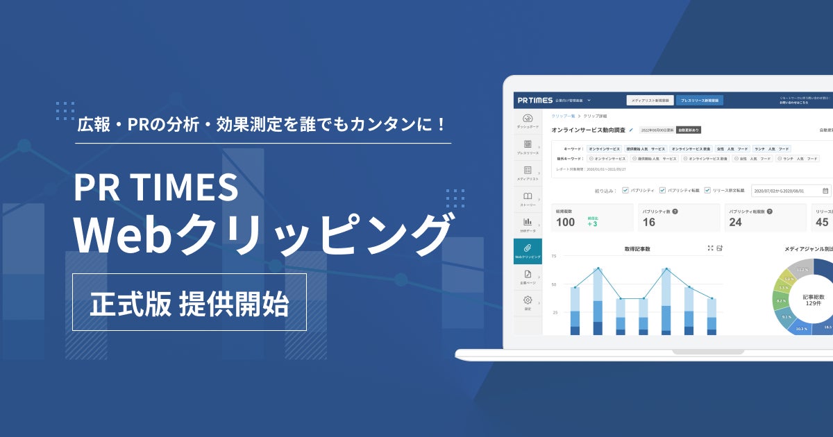 プレスリリース配信サービス「PR TIMES」等を運営する株式会社PR TIMES(東京都港区、代表取締役:山口拓己、東証プライム:3922)は2023年2月21日(火)より、広報活動や自社に関する報道などの調査・分析に役立つ「PR TIMES Webクリッピング」正式版の提供を開始いたします。