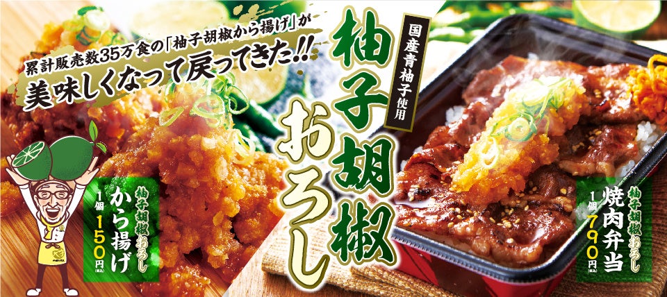 累計販売数35万食の人気メニュー「柚子胡椒」が美味しくなって今年も登場します。上品な辛さの中にほんのり香るさわやかな柚子胡椒とさっぱり大根おろしがジューシーなから揚げや焼肉弁当にピッタリです!「柚子胡椒おろしから揚げ」150円(税込)、「柚子胡椒おろし焼肉弁当」790円(税込)で販売致します。