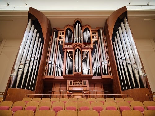 アメリカ、C. B. フィスク社製。輝くような明るい音色にふさわしく、「光」を意味するラテン語“lux”に由来する“ルーシー”という愛称で親しまれています。ホンジュラス・マホガニー製のケースには、横浜にちなんだカモメの彫刻が施されています。現代のコンサートホールにおけるオルガンの理想を追求して設計されているため、バッハ以前の時代から現代に至る多種多様なオルガン曲を、それぞれの時代にふさわしい音色で演奏することができます。
