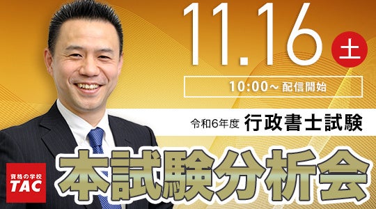 行政書士試験対策講座を展開しているTAC株式会社(東京都千代田区、代表取締役:多田敏男)は、11/10(日)に実施される『令和6年度(2024年度)行政書士試験』の解答速報を試験当日にTACのWebサイトで公開いたします。