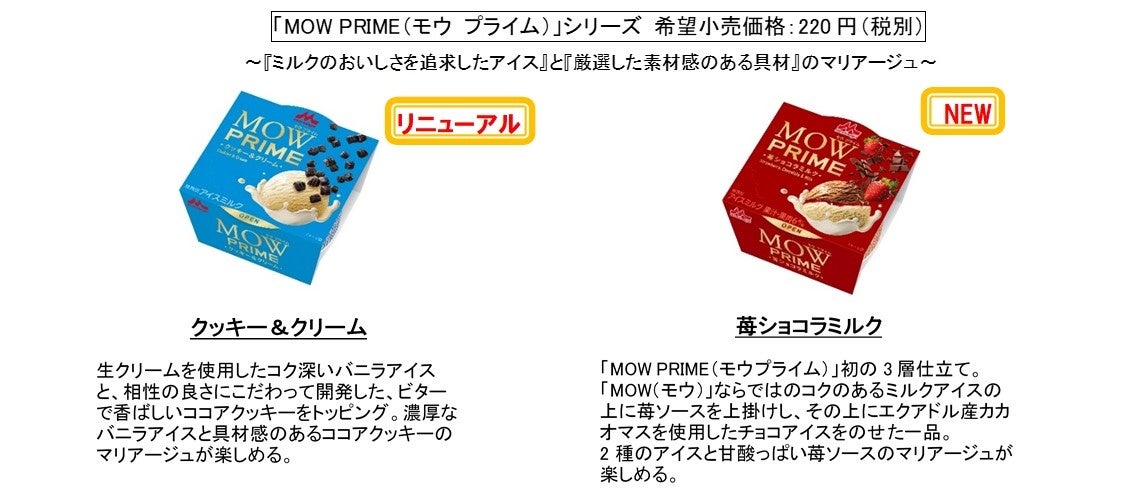「MOW PRIME(モウ プライム)苺ショコラミルク」の発売に合わせ、現在発売中の「MOW PRIME(モウ プライム)クッキー&クリーム」のデザインをリニューアルいたします。