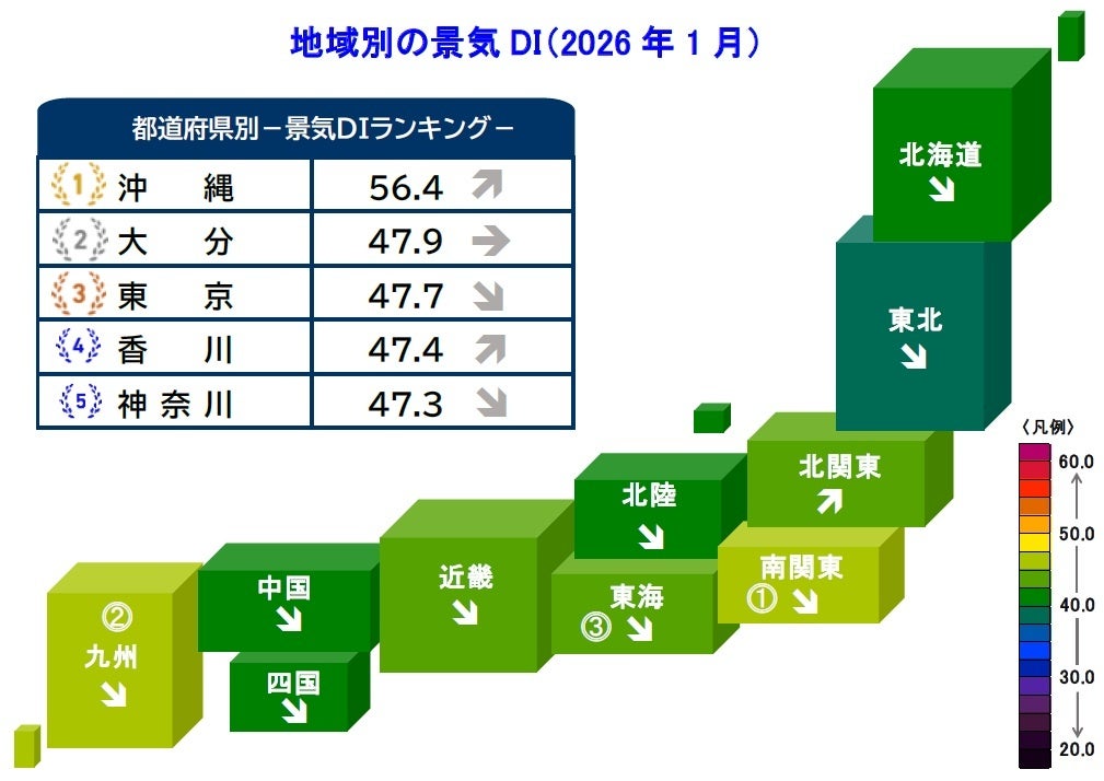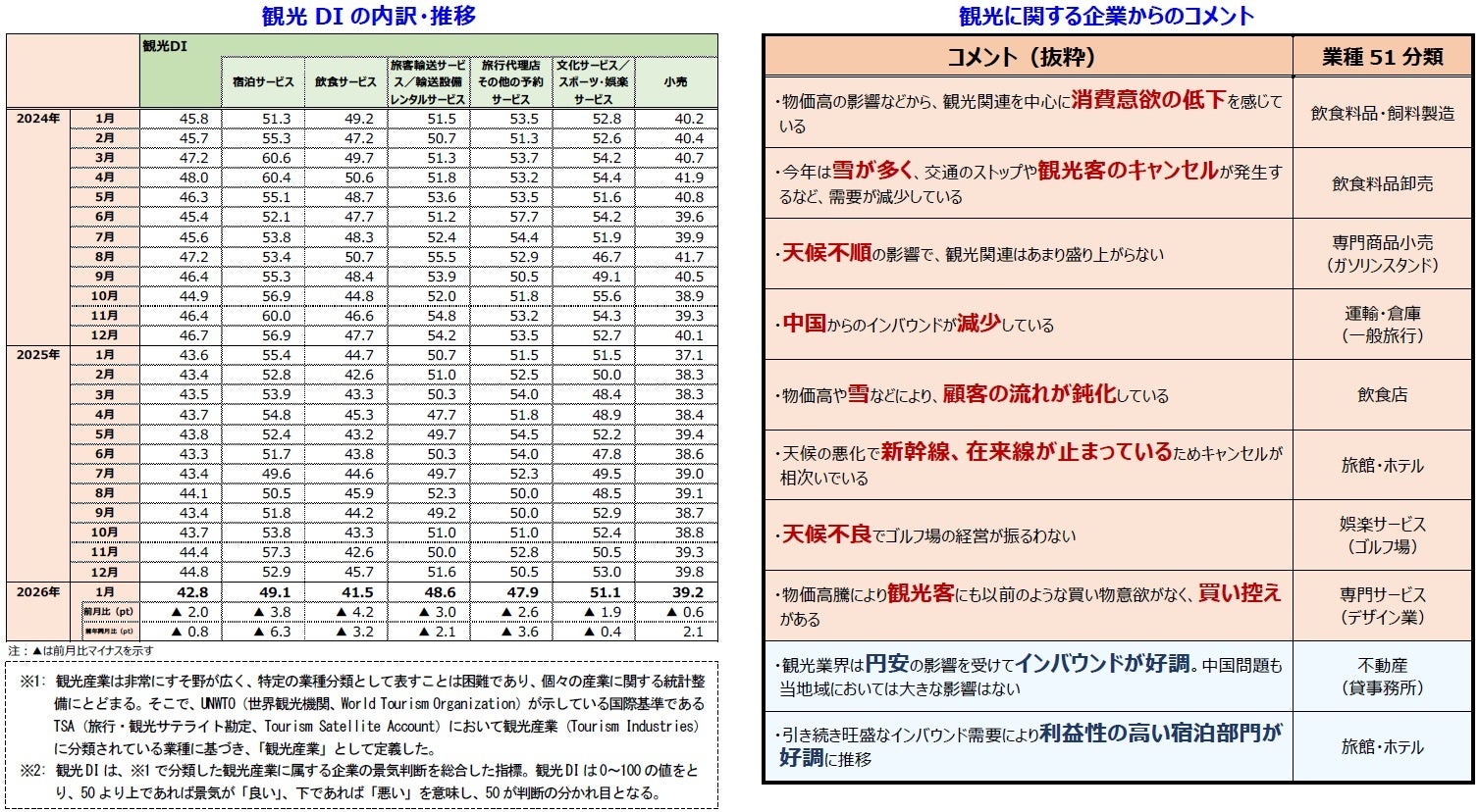 2026年1月の景気DIは前月比0.6ポイント減の43.8となり、8カ月ぶりに悪化した。国内景気は、年末商戦や旅行需要の反動が表れ、改善基調のなかでいったん足踏みとなった。