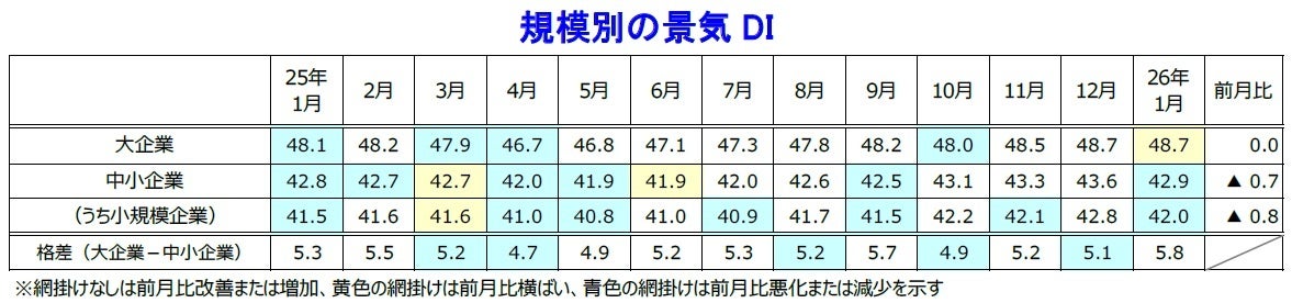 「大企業」は前月から横ばいだった一方で、「中小企業」「小規模企業」は悪化した。年末年始商戦後の消費の一巡が広く影響するなか、「大企業」では、一部業種における堅調な海外向け需要がみられる『製造』が下支え要因となった。