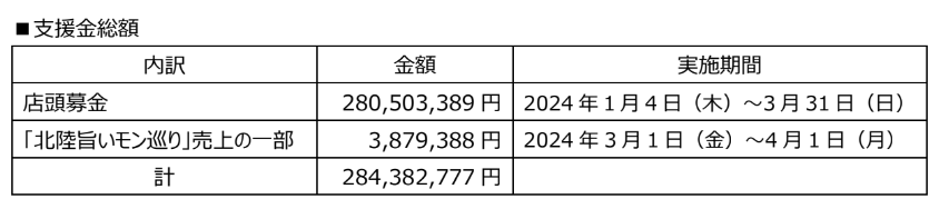 株式会社ファミリーマート(本社:東京都港区、代表取締役社長:細見 研介)と国内エリアフランチャイズ各社(※)は、2024年1月4日(木)から3月31日(日)までの期間、全国のファミリーマート約16,300店の店頭で、支援金募金を実施いたしました。期間中皆さまからお寄せいただいた募金と、2024年3月1日(金)から4月1日(月)にて実施した「北陸旨いモン巡り」の売上の一部を以下の通り寄託いたします。 ※株式会社沖縄ファミリーマート、株式会社南九州ファミリーマート、JR九州リテール株式会社