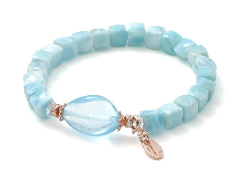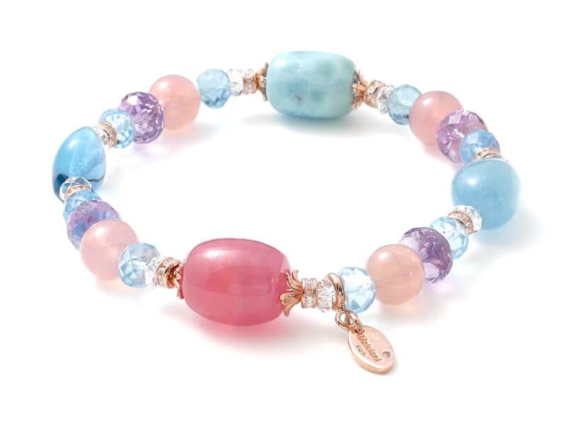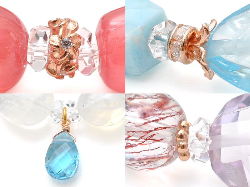 ロンドンブルートパーズ、ラリマー、インカローズなど、年々希少価値が高まる石を贅沢に使用したブレスレットは、手にするたびに、心が軽やかに、同時に落ち着きをもたらすような、優しく大きな愛の波動が満載。