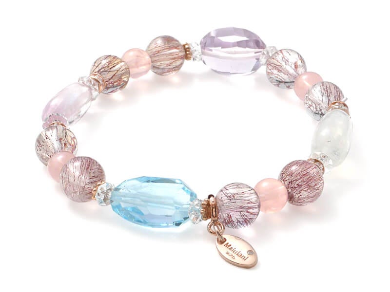 アクアマリンやアメジスト、ブルートパーズやマダガスカル産のローズクォーツなど、幸せな生活をもたらす石がきらめきを添え、美しくも頼もしいパワーストーンブレスレットとなりました。