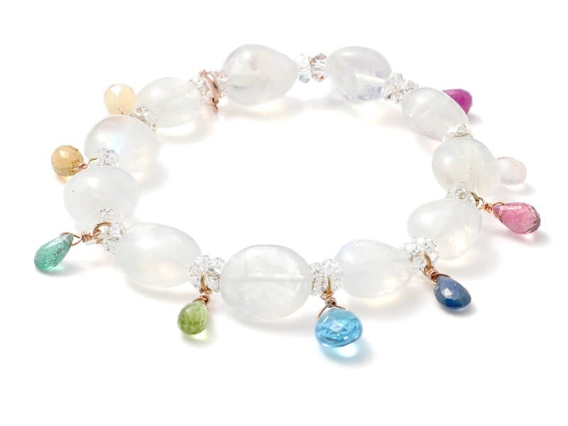 美しく幻想的な輝きを放つレインボームーンストーンと、繊細なブリオレットカットを施したカラーストーンで紡いだ、シンプルかつ華やかなエネルギー満載のブレスレット。