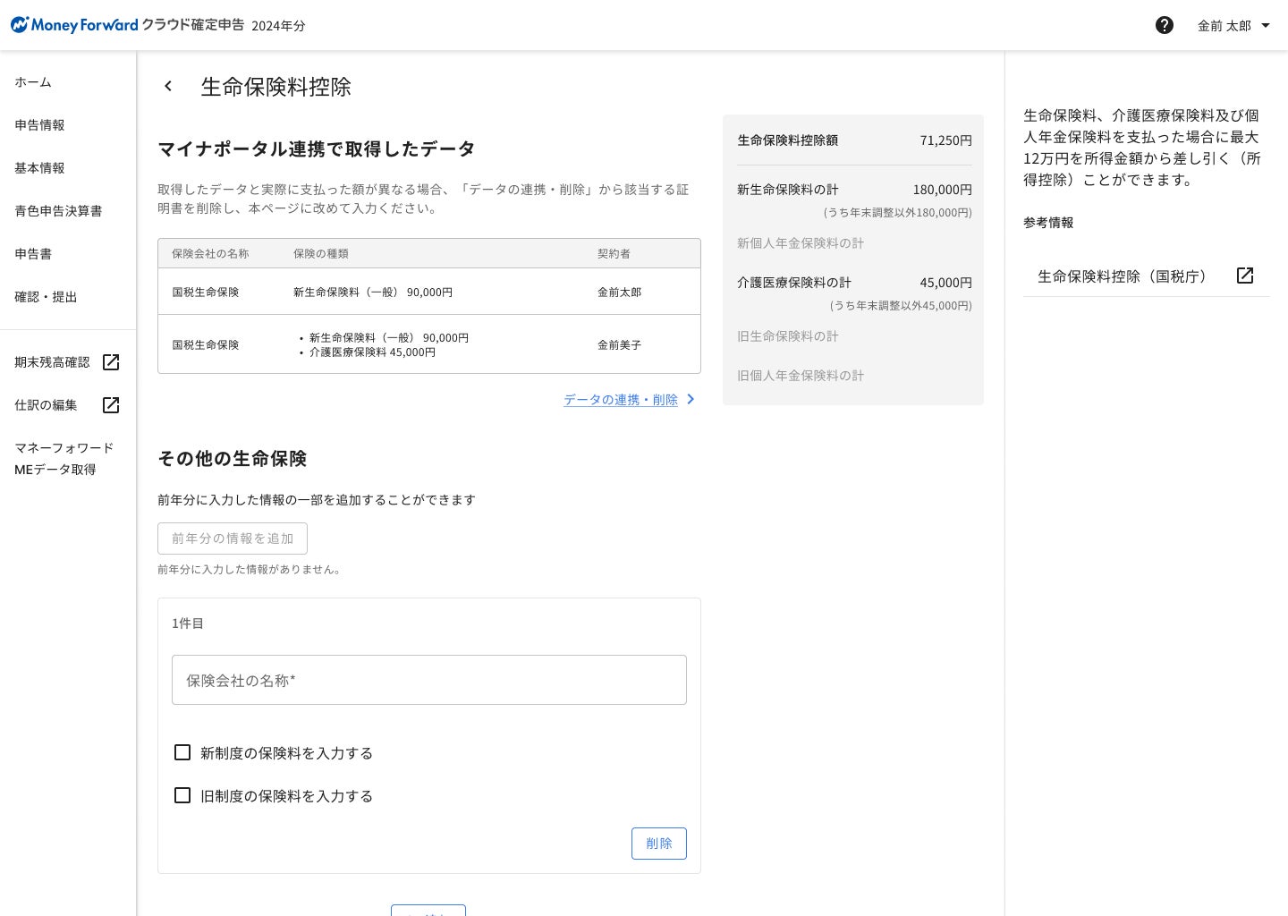 5. 「申告書」画面に取得された証明書の金額等が反映されます。