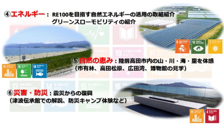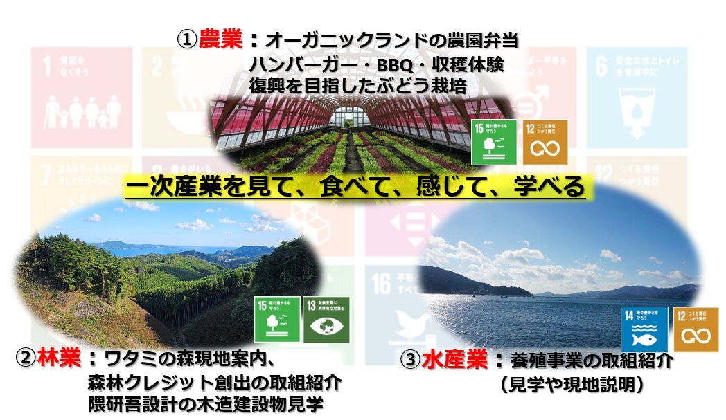 「体験型SDGsツアー」は、SDGs未来都市に選定されている陸前高田市において、大きく6つの視点(①農業、②林業、③水産業、④エネルギー、⑤自然の恵み、⑥災害、防災)から、【いのち】を感じることができるツアーです。非日常体験を通して、自然との調和、アクティビティ参加、交流体験を通じたふれあいを重視する、ここでしかできない宿泊文化体験が可能です。