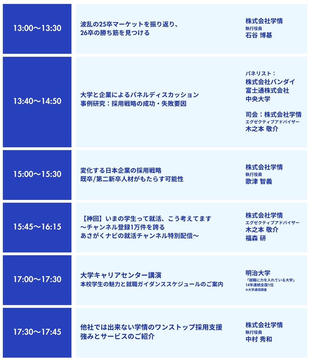 20代通年採用を20年間提唱・実践してきた学情が、年に一度の特別セミナーを開催します。企業の人事担当者様と大学の就職指導担当者様をお招きし、これからの採用市場を読み解きます。