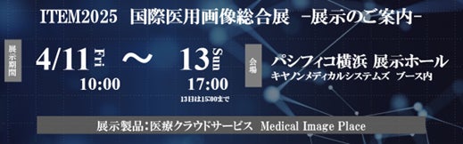 キヤノンIMは、 ITEM2025におけるキヤノンメディカルシステムズブース内の展示を通じ、医療クラウドサービスMedical Image Placeの「モバイル画像参照サービス」「コミュニケーションサービス」を活用した医師の働き方改革や医療DXの取組みを支援する活用事例を紹介します。