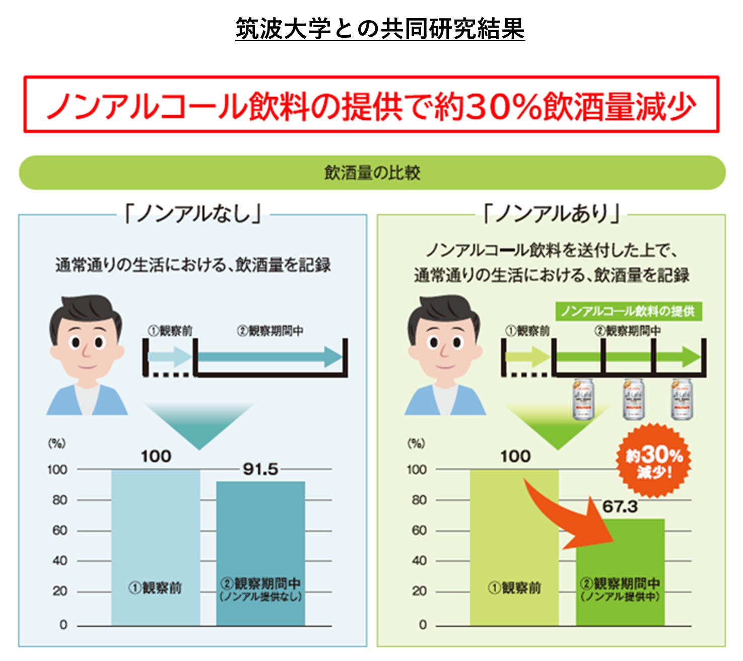 アサヒビール株式会社(本社 東京、社長 松山一雄)と筑波大学は、「健康経営」を推進する企業の厚生労働省が定める「生活習慣病のリスクを高める量」の飲酒習慣がある一部の従業員を対象※1に、ノンアルコール飲料の提供が飲酒量に与える影響に関する研究を8月26日から社会実装に向けて開始します。企業の「健康経営」推進のために、他企業の協力を得ながら研究を実施することで、社会的なアルコール課題の解決に向けた知見の獲得を目指します。
