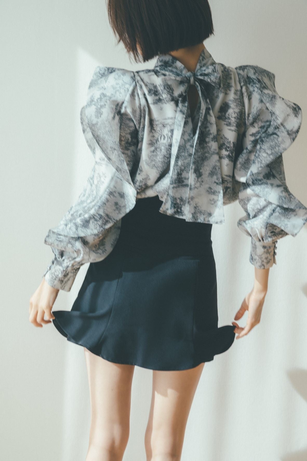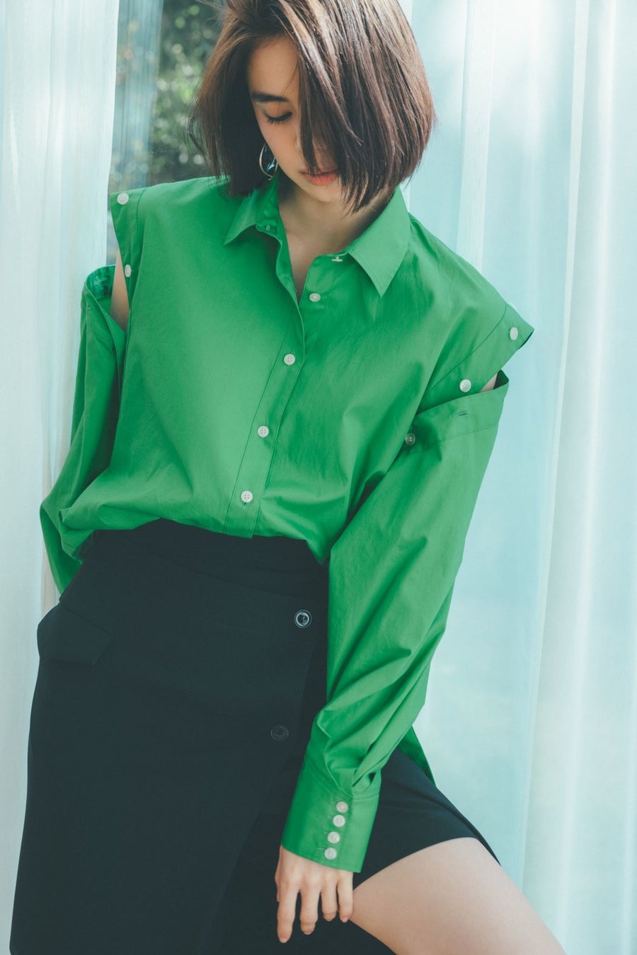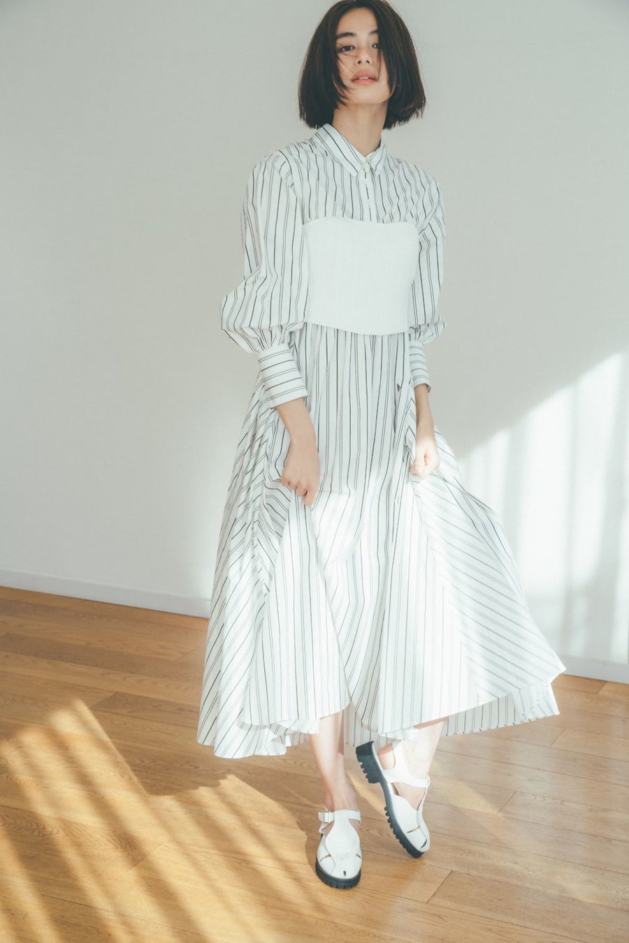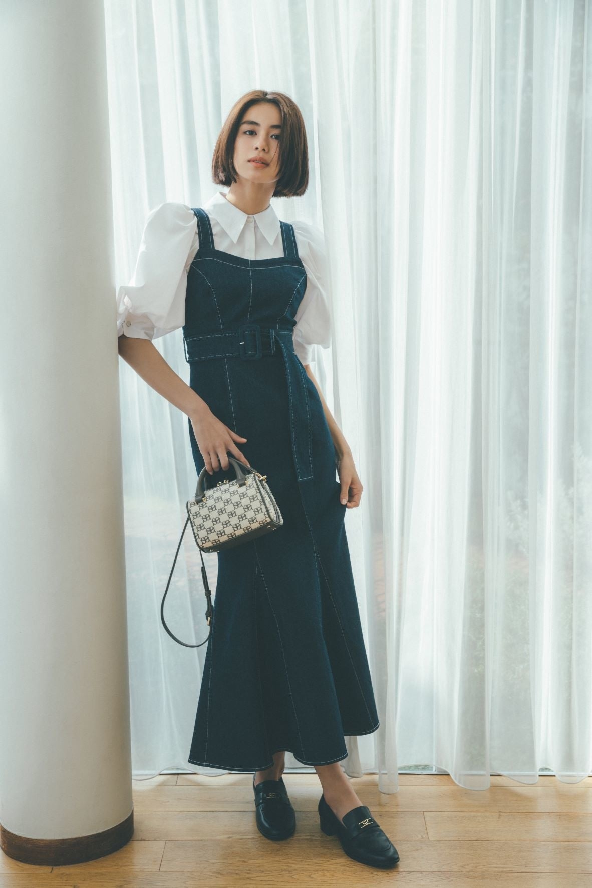 ハリ感のある構築的なパフスリーブやラインディテールはモードなエッセンスを加え、洗練された印象に。